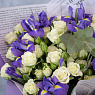 Весёлый букет с розами и ирисами принесёт нотку радости и праздника в любой дом.