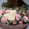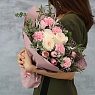 Воплощенная романтика и нежность – букет из пышных роз, воздушных гвоздик и розовых тюльпанов в окружении зелени. Композиция без слов рассказывает о любви и преданности, нежности и заботе. К такому подарку невозможно остаться равнодушной.