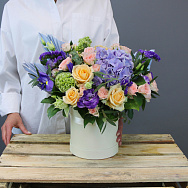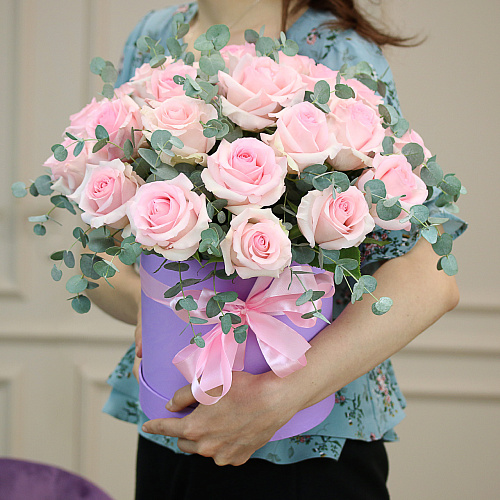 Композиция из цветов нежного, светло-розового оттенка станет идеальным подарком для любимой. Пышный букет, декорированный листьями эвкалипта, сразу вызовет радостную улыбку и создаст романтичную атмосферу.